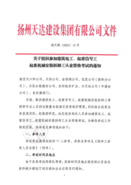 關(guān)于組織參加建筑電工、起重信號(hào)工、起重機(jī)械安裝拆卸工從業(yè)資格考試的通知
