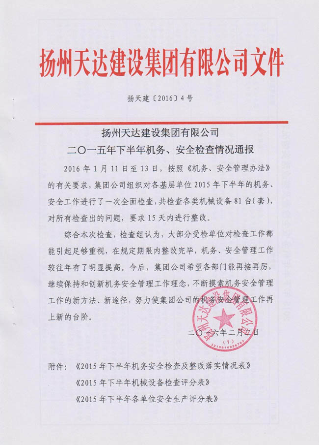 揚(yáng)州天達(dá)建設(shè)集團(tuán)有限公司二O一五年下半年機(jī)務(wù)、安全檢查情況通報(bào)