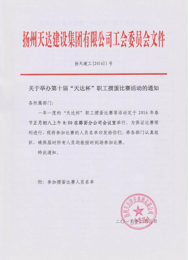 關(guān)于舉辦第十屆“天達(dá)杯”職工摜蛋比賽活動(dòng)的通知