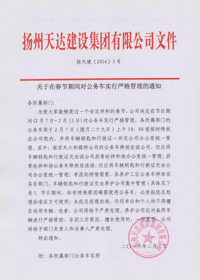 關于在春節(jié)期間對公務車實行嚴格管理的通知