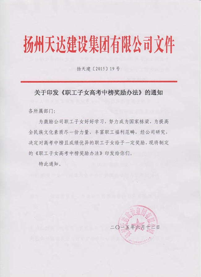關(guān)于印發(fā)《職工子女高考中榜獎勵辦法》的通知