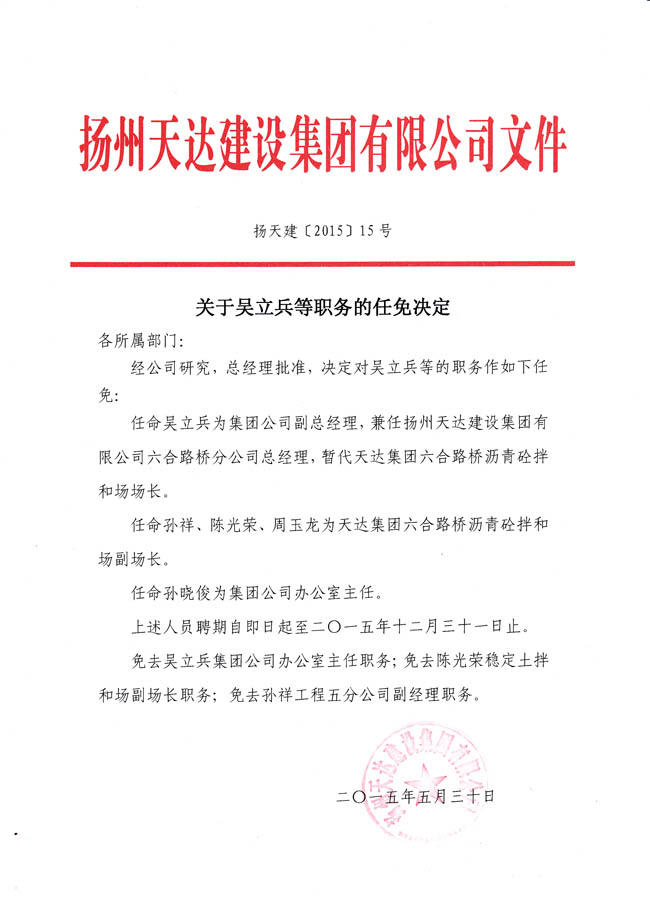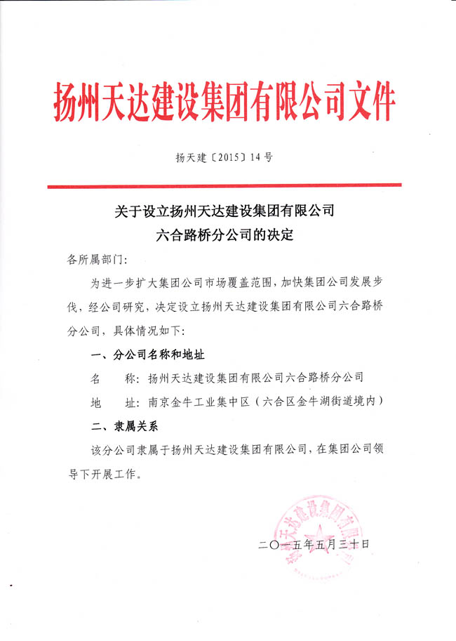 關(guān)于設(shè)立揚州天達建設(shè)集團有限公司六合路橋分公司的決定