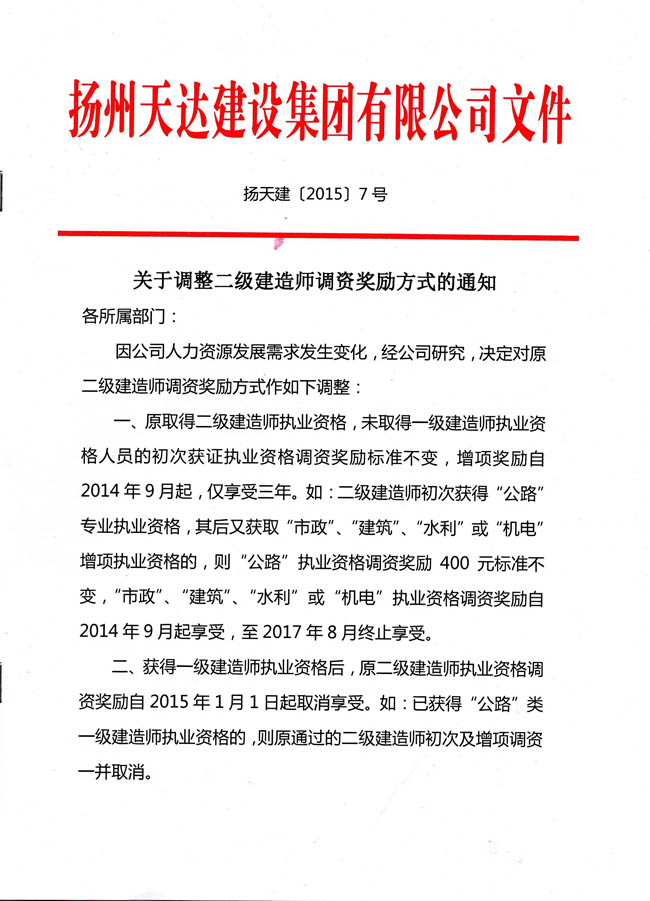 關(guān)于調(diào)整二級建造師調(diào)資獎勵方式的通知