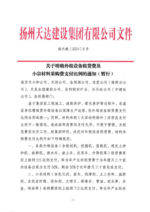 關于明確外租設備租賃費及小宗材料采購費支付比例的通知(暫行)