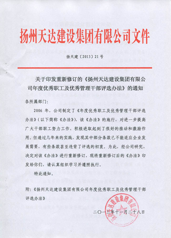 關(guān)于印發(fā)重新修訂的《揚(yáng)州天達(dá)建設(shè)集團(tuán)年度優(yōu)秀職工及優(yōu)秀管理干部評(píng)選辦法》的通知