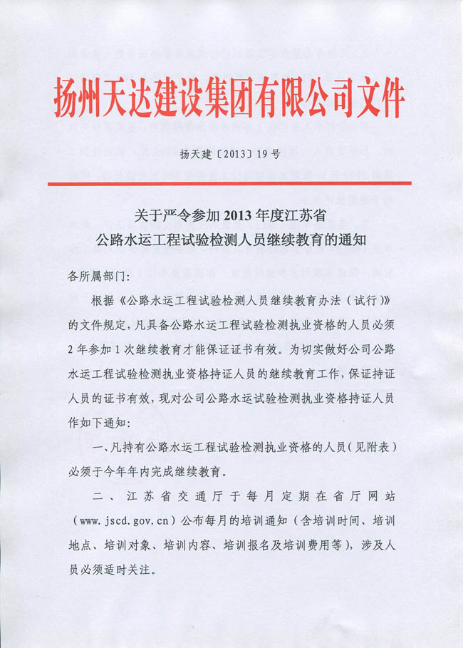 關于嚴令參加2013年度江蘇省公路試驗檢測人員繼續(xù)教育的通知