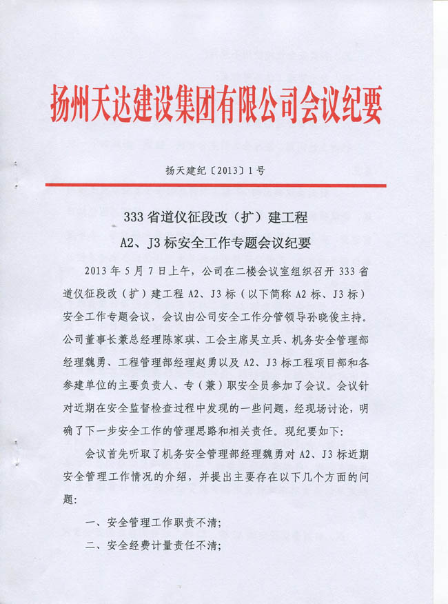 333省道儀征段改(擴(kuò))建工程A2、J3標(biāo)安全工作專題會(huì)議紀(jì)要