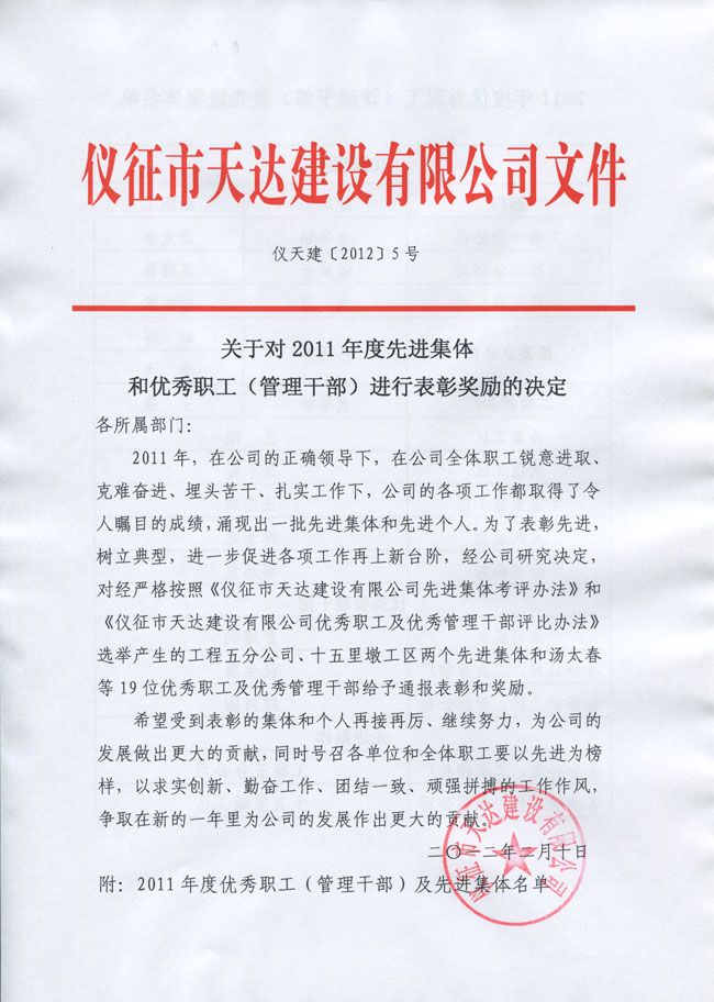 關(guān)于對2011年度先進集體和優(yōu)秀職工(管理干部)進行表彰獎勵的決定