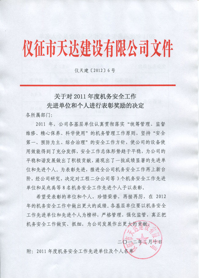 關(guān)于對2011年度機務(wù)安全工作先進單位和個人進行表彰獎勵的決定