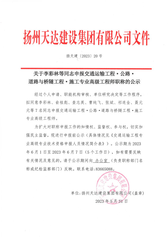 關(guān)于李彩林等同志申報(bào)交通運(yùn)輸工程·公路·道路與橋隧工程·施工專業(yè)高級(jí)工程師職稱的公示