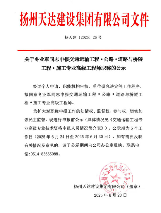 關(guān)于冬業(yè)軍同志申報交通運輸工程?公路?道路與橋梁工程?施工專業(yè)高級工程師職稱的公示
