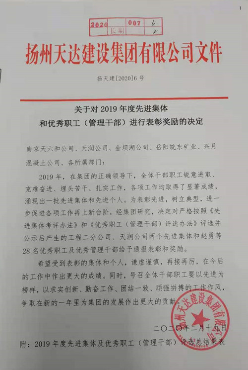 關(guān)于對2019年度先進集體和優(yōu)秀職工(管理干部)進行表彰獎勵的決定