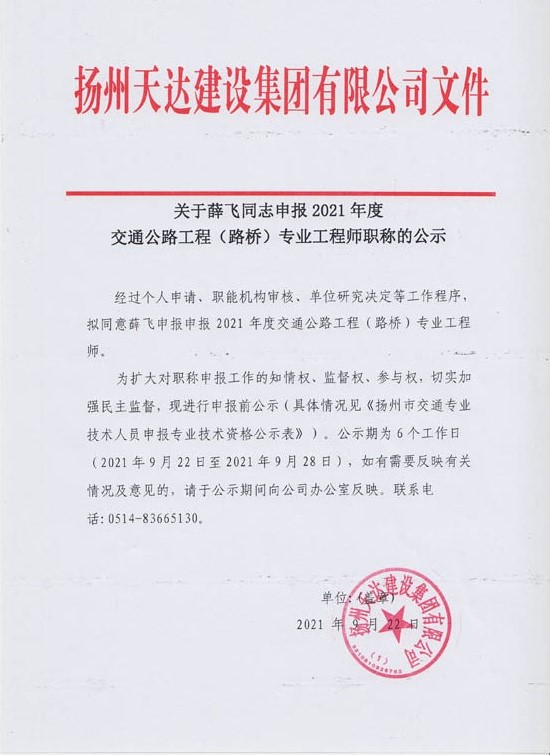 關(guān)于薛飛同志申報2021年度交通公路工程(路橋)專業(yè)工程師職稱的公示