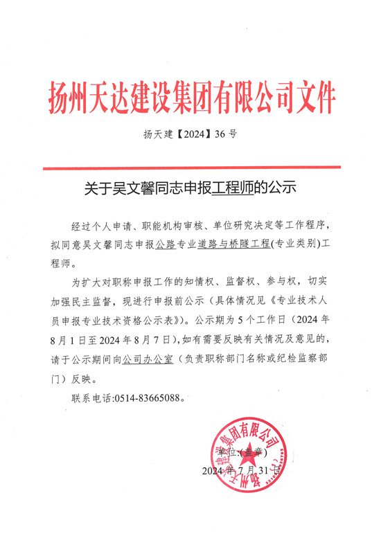 關于吳文馨同志申報工程師的公示