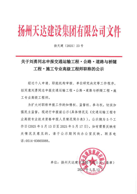 關于劉勇同志申報交通運輸工程?公路?道路與橋隧工程?施工專業(yè)高級工程師職稱的公示