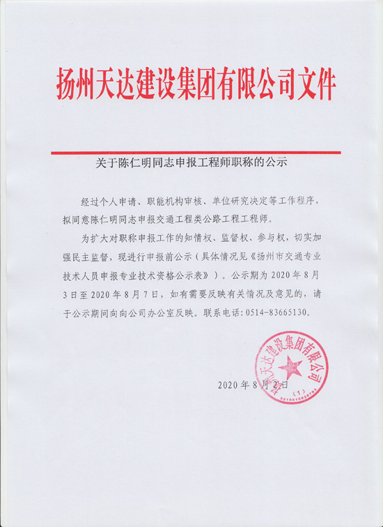 關(guān)于陳仁明同志申報(bào)工程師職稱的公示