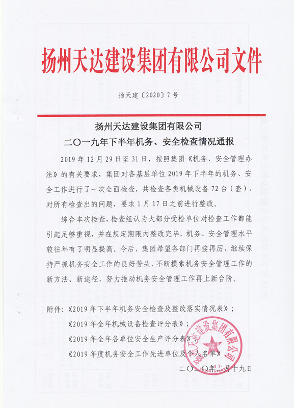 揚州天達建設集團有限公司2019年下半年機務、安全檢查情況通報