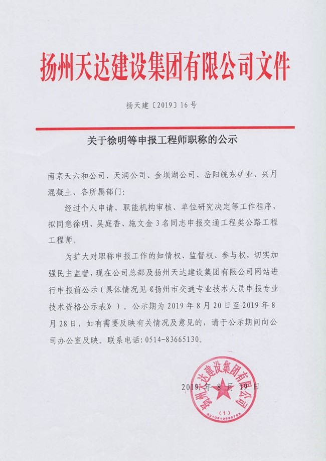 關(guān)于徐明等申報(bào)工程師職稱的公示