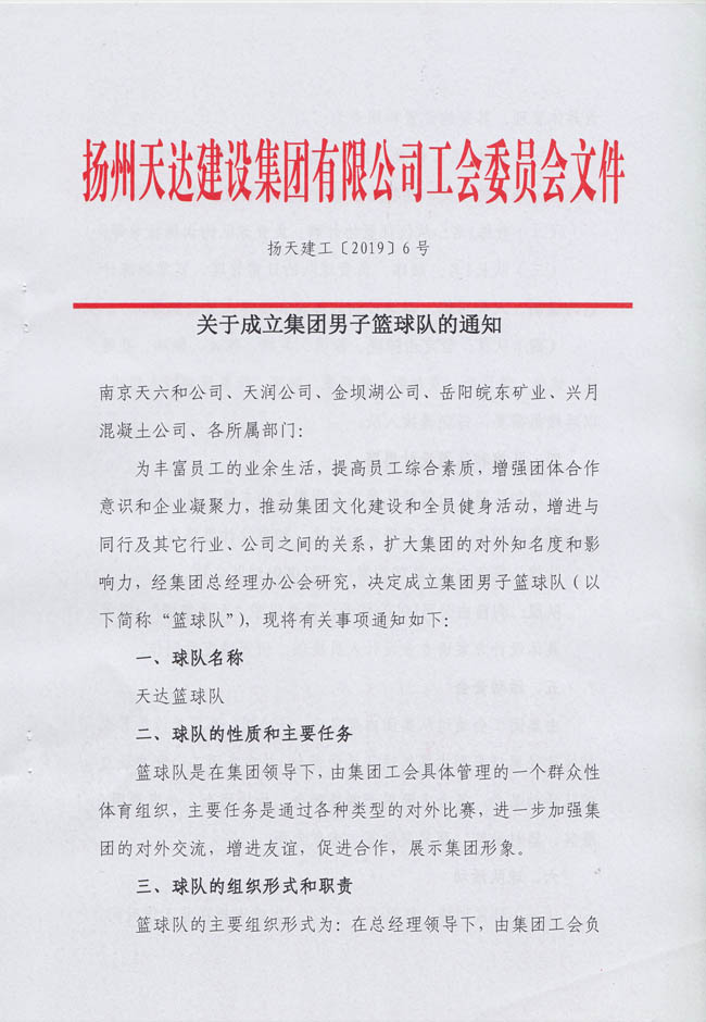 關(guān)于成立集團男子籃球隊的通知