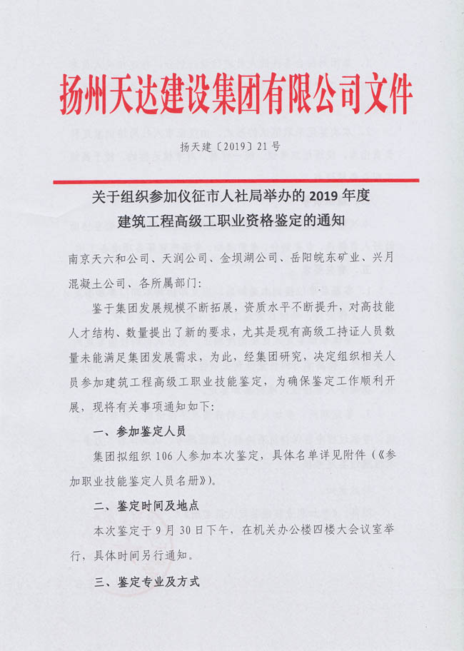 關(guān)于組織參加儀征市人社局舉辦的2019年度建筑工程高級工職業(yè)資格鑒定的通知