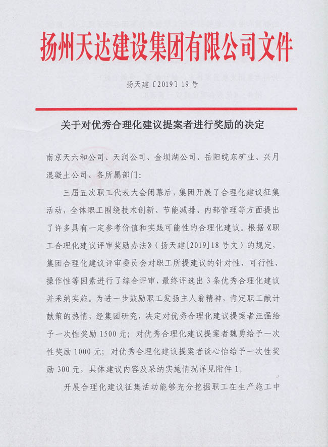 關(guān)于對優(yōu)秀合理化建議提案者進行獎勵的決定
