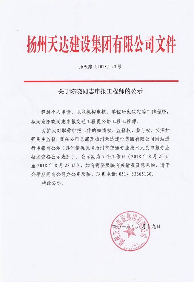 關(guān)于陳曉同志申報(bào)工程師的公示