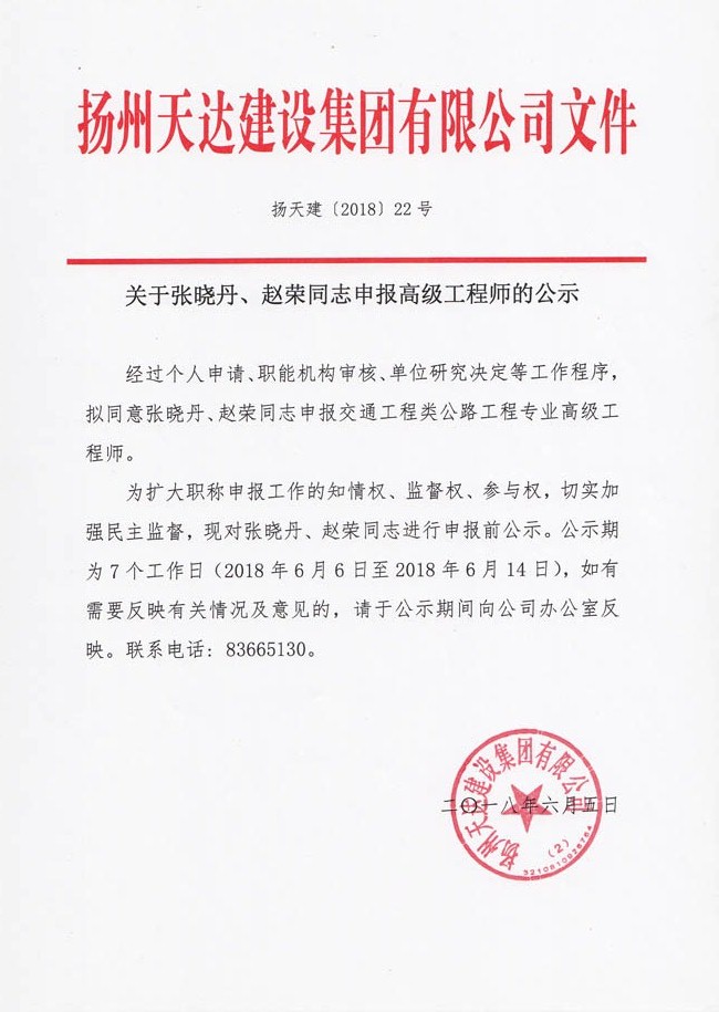 關于張曉丹、趙榮同志申報高級工程師的公示