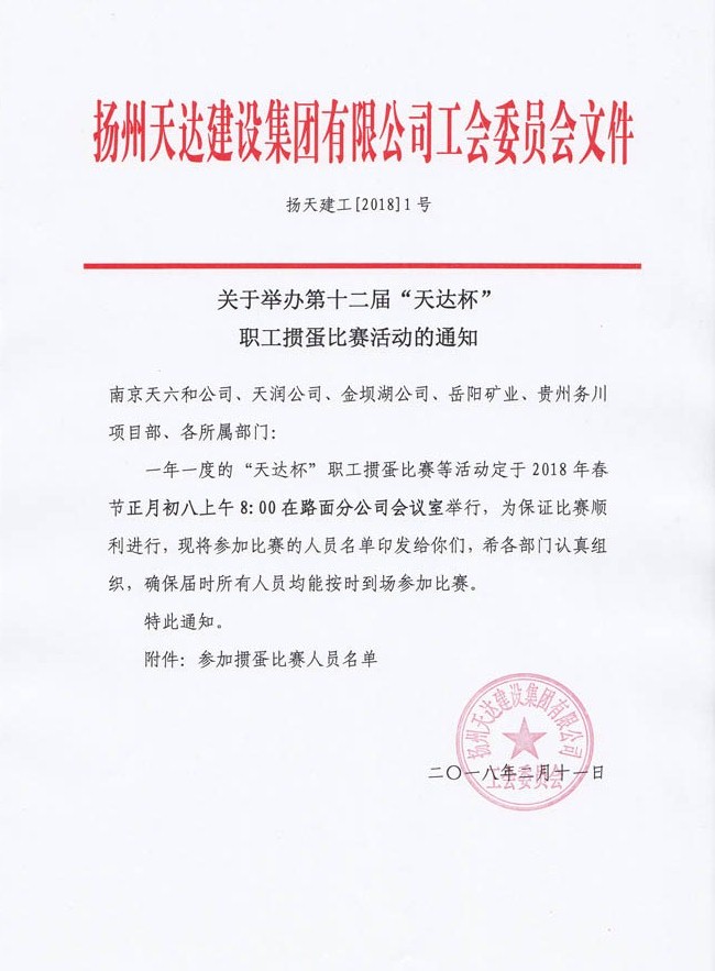 關(guān)于舉辦第十二屆“天達杯”職工摜蛋比賽活動的通知
