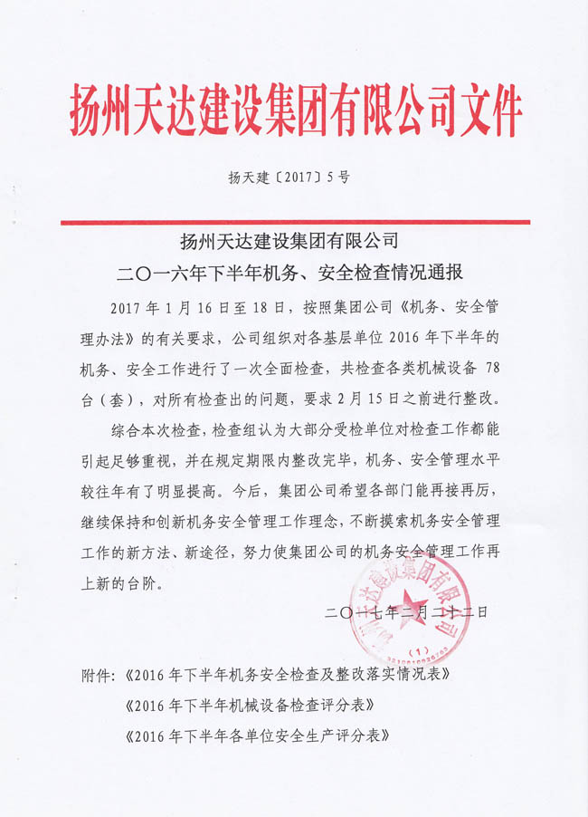 揚州天達建設(shè)集團有限公司二〇一六年下半年機務(wù)、安全檢查情況通報
