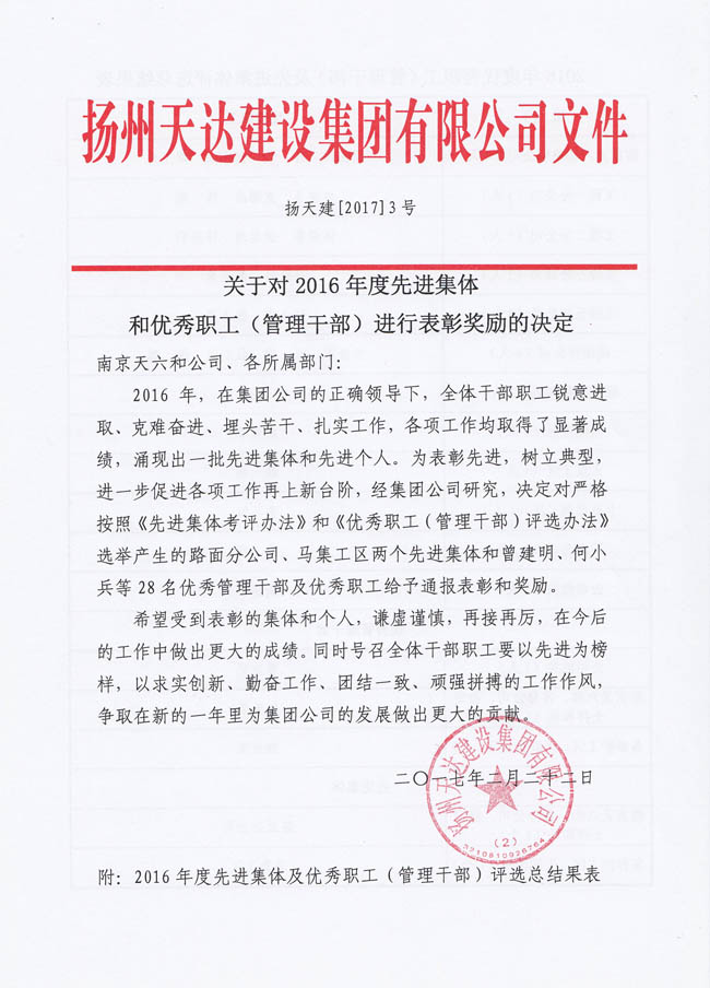 關(guān)于對2016年度先進(jìn)集體和優(yōu)秀職工(管理干部)進(jìn)行表彰獎勵的決定