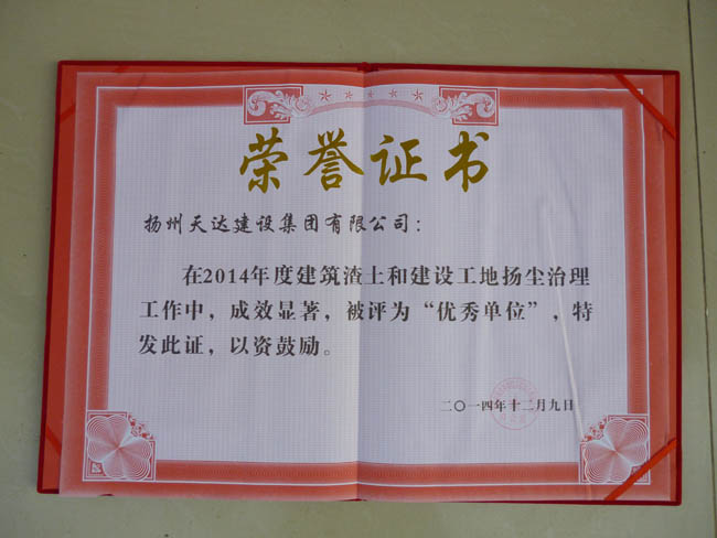 公司榮獲儀征市城市環(huán)境綜合治理工作推選小組授予的2014年度建筑渣土和建設(shè)工地?fù)P塵治理工作“優(yōu)秀單位”榮譽稱號