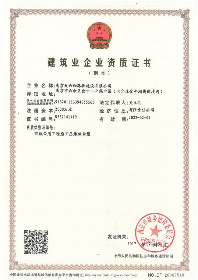 2月中旬,南京天六和路橋建設(shè)有限公司正式通過南京市城鄉(xiāng)建設(shè)委員會審批,順利取得了市政公用工程施工總承包三級企業(yè)資質(zhì)證書。