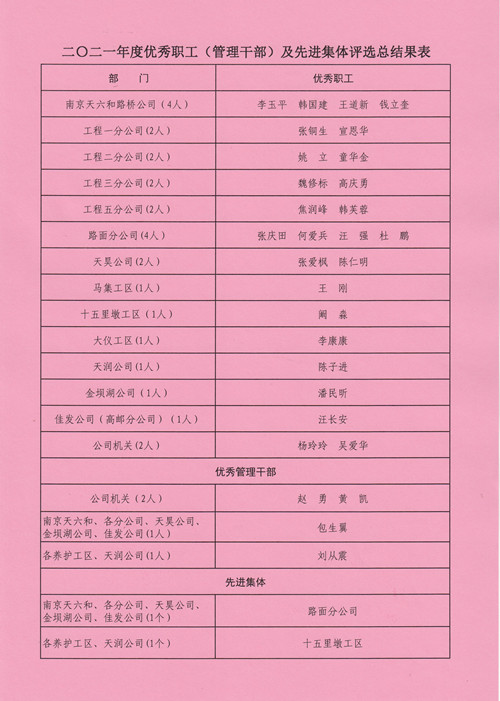 2022年1月25日中午,集團召開2021年度先進集體和優(yōu)秀職工(管理干部)評選會議,集團董事長兼總經(jīng)理陳曉、特別顧問陳家琪、副總經(jīng)理兼工會主席吳立兵、總工程師王明紅等領(lǐng)導(dǎo)出席會議,各基層單位主要負責人及機關(guān)全體干部共40人參加會議。會議由黨支部書記兼辦公室主任孫曉俊主持。 會上,黨支部書記孫曉俊首先介紹了2021年度優(yōu)秀職工(管理干部)及先進集體評選注意事項、評選資格審查、工作人員安排等;特別顧問陳家琪簡要介紹了南京天六和、各分公司、天昊公司、天潤公司一年來的生產(chǎn)運營情況,以及相關(guān)基層單位負責人和機關(guān)管理干部的履職情況;陳曉董事長通報了金壩湖公司、興月(中建)公司、岳陽皖東礦業(yè)、佳發(fā)公司一年來的生產(chǎn)經(jīng)營情況及主要負責人的履職情況;養(yǎng)護公司經(jīng)理曾建明介紹了各養(yǎng)護工區(qū)一年來的生產(chǎn)經(jīng)營情況和主要負責人的履職情況。會議通過無記名投票方式,評選產(chǎn)生了各基層單位先進集體2個、優(yōu)秀管理干部2名,機關(guān)優(yōu)秀職工2名、優(yōu)秀管理干部2名,評選結(jié)果產(chǎn)生后,工會主席吳立兵向大會宣布了評選總結(jié)果。 此前,自1月17日起,集團評優(yōu)工作小組根據(jù)各基層單位生產(chǎn)施工實際,充分利用基層單位空閑時間,先后完成了南京天六和公司、各分公司、天昊公司、金壩湖公司、各養(yǎng)護工區(qū)、天潤公司、佳發(fā)公司共13個基層單位優(yōu)秀職工評選工作。評選結(jié)果已在集團網(wǎng)站、微信群進行了公示。