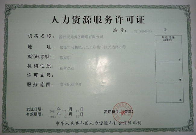 2011年12月13日,由公司注資成立的揚(yáng)州天元?jiǎng)趧?wù)派遣有限公司順利取得了儀征市人力資源和社會(huì)保障局頒發(fā)的《人力資源服務(wù)許可證》,該許可證的取得,標(biāo)志著該公司已完全具備從事境內(nèi)職業(yè)中介服務(wù)資格。